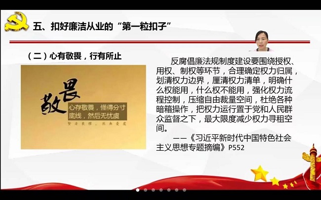 徐秀云从习近平总书记关于党风廉政建设的重要论述出发,为毕业生党员讲了党的十八大以来,以习近平同志为核心的党中央从制定执行中央八项规定切入,下大力气改进作风,依纪依法严惩腐败,不断将党风廉政建设和反腐败斗争向纵深推进,让人民群众看到了实实在在的成效和变化。她要求全体毕业生党员要深入学习贯彻习近平新时代中国特色社会主义思想,按照“学思想、强党性、重实践、建新功”的总要求,原原本本读原著,学原文,悟原理,坚定信念、廉洁从业,心有敬畏、行有所止,律己修身、拒腐防变,扣好廉洁从业的“第一粒扣子”,以实际行动践行社会主义核心价值观,始终保持蓬勃朝气,弘扬浩然正气,为实现中华民族伟大复兴的中国梦贡献自己的力量。