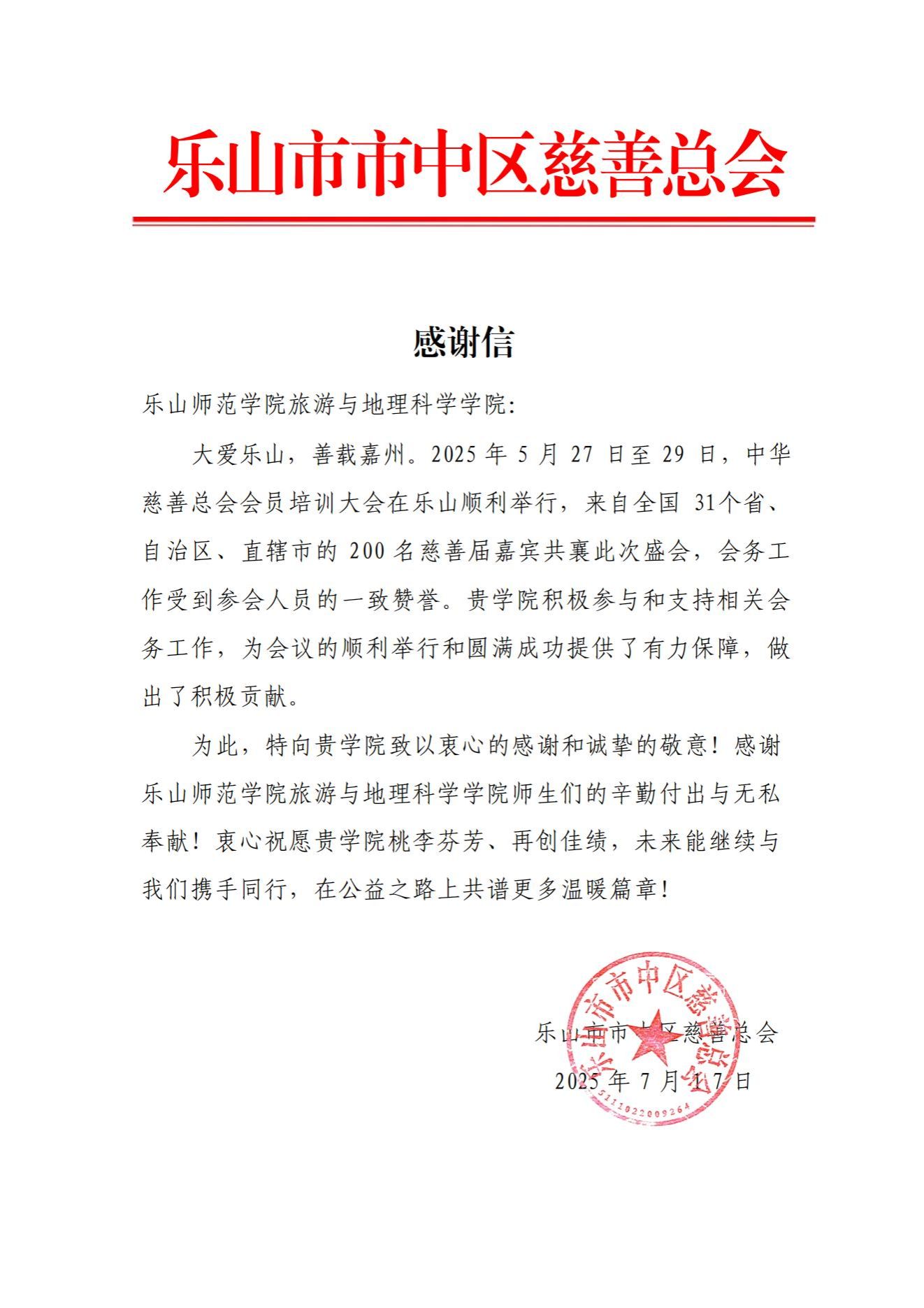 本网讯(文、图/郑曾俊)近日,乐山市市中区慈善总会专程向BETWA西汉姆联致送感谢信,感谢我院师生在今年5月27日至29日中华慈善总会会员培训大会中的贡献。