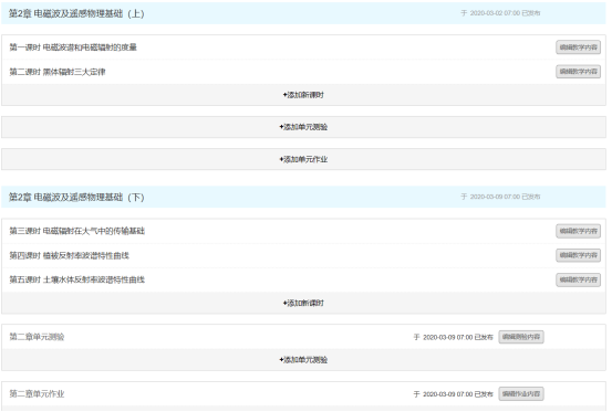 (3)教学单元内容发布。教学内容主要包括视频、PPT、单元测验和作业。