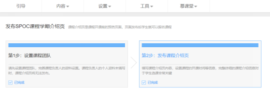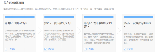 (2)完成课程介绍页和学习页的发布。课程介绍页是课程开课前的预告页面,页面发布后学生就可以报名课程;课程学习页是学生主要的学习场所,将在开课时间发布。开课时学习页必须有欢迎公告、评分标准、课件、课程讨论区。