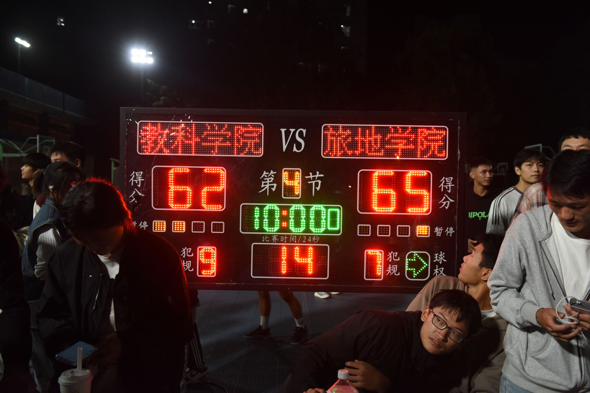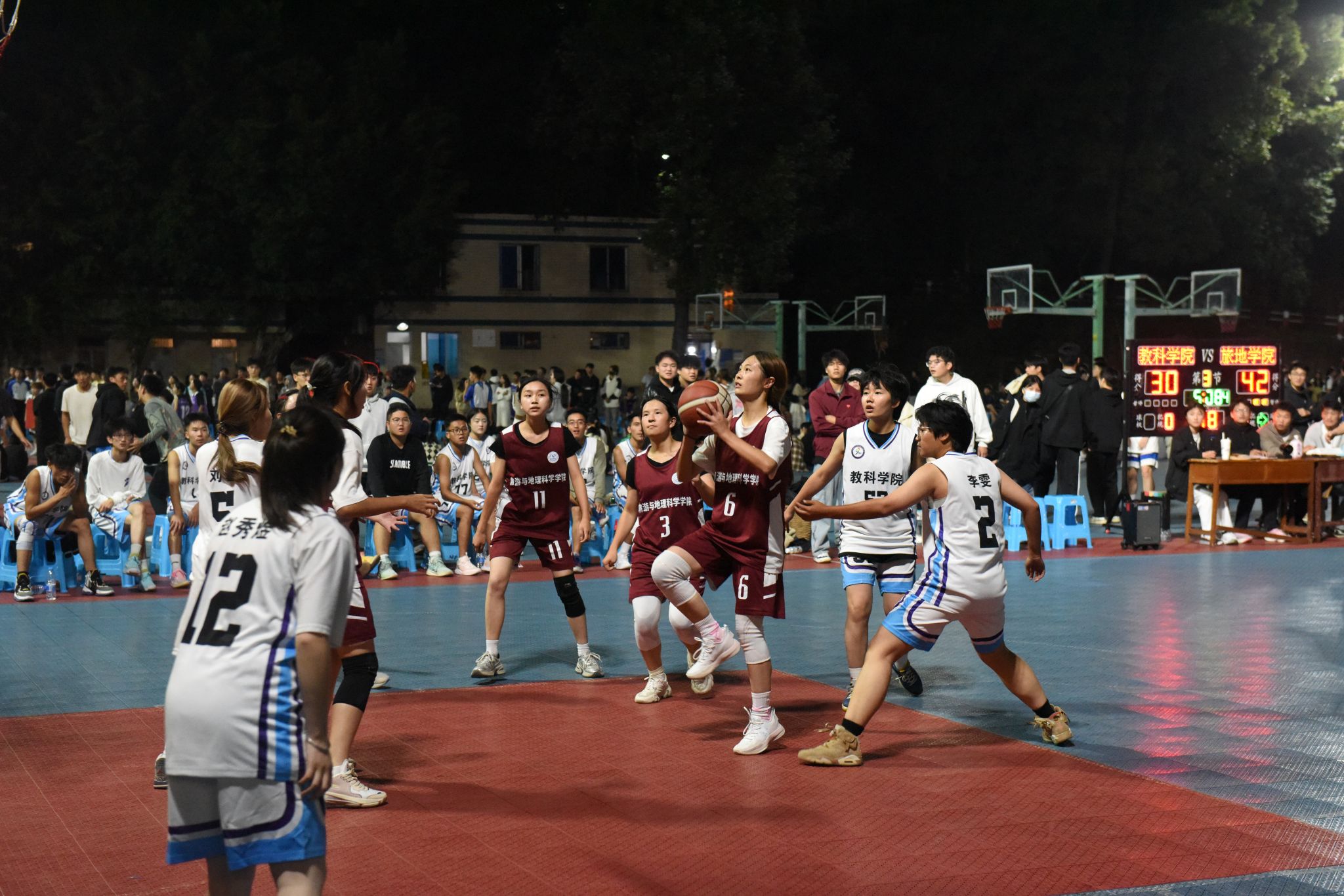 裁判一声哨响,比赛正式开始,观众们的加油呐喊声此起彼伏,队员们士气高涨,奋力拼搏。在比赛中,旅地学院的队员们跑位灵活、传球出色,前锋突破迅猛;教科学院的队员们防守强硬,后卫远投精准。双方队员你来我往,使得比分始终相持不下。场下的观众们也高声欢呼,为队员们加油鼓劲。