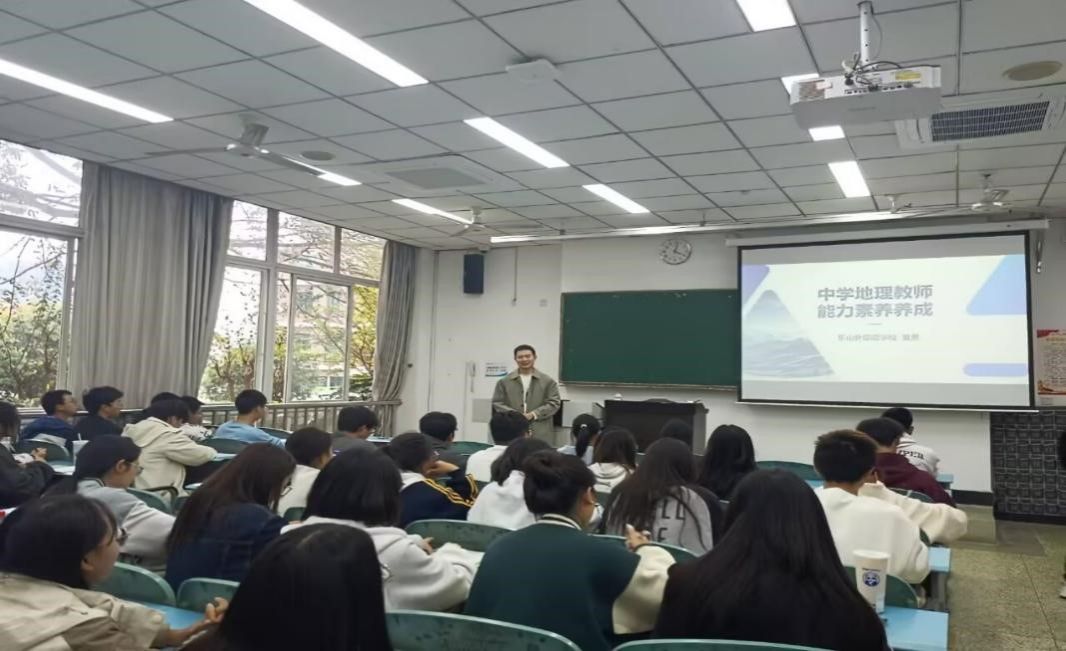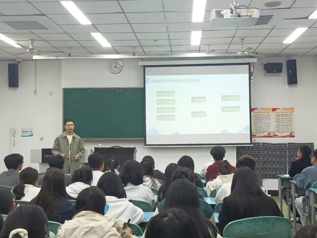 本次讲座围绕中学地理教师能力素养展开。夏老师详细介绍了中学地理的学科特色素养、专业知识素养、地理教师应具备的教研素养和基本能力,通过分享自己的教学经历和教学经验,加深了同学们对地理教师这一职业的了解。