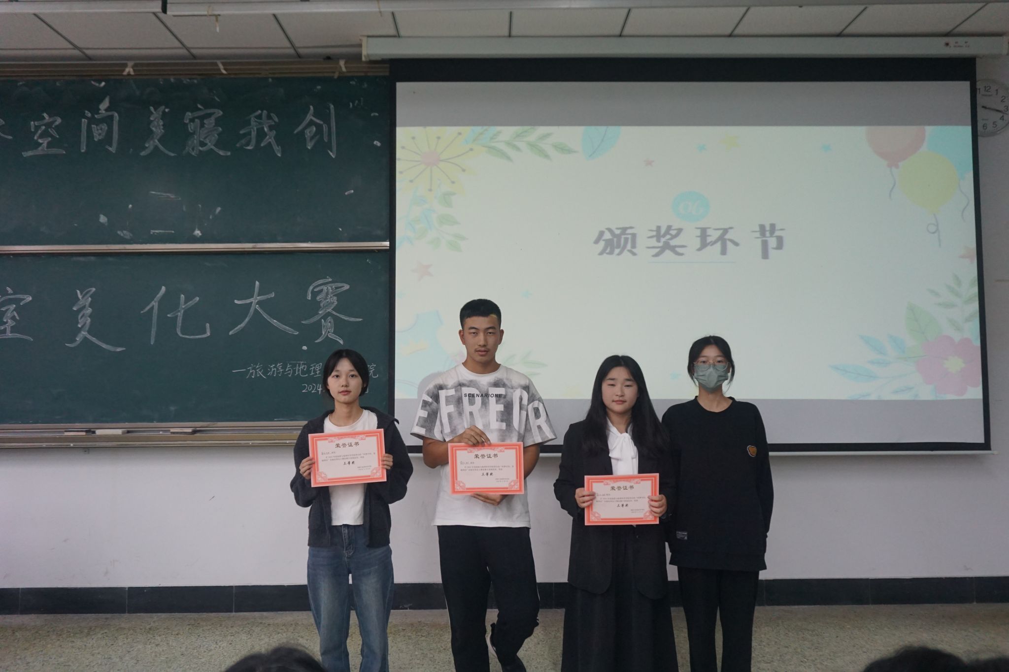 本次比赛共七个寝室进行对决,各寝室分别讲解了寝室图标与寝室宣言等,展现了同学们积极向上、团结友爱、富有创意的良好精神风貌,体现出同学们对寝室这个“小家”的热爱。之后,同学们进行了精彩的才艺展示,让整个比赛现场充满了青春活力与温馨氛围。在激烈的比拼之后,百七幢506寝室的同学们获得了第一名,由干麟杰为她们颁奖。