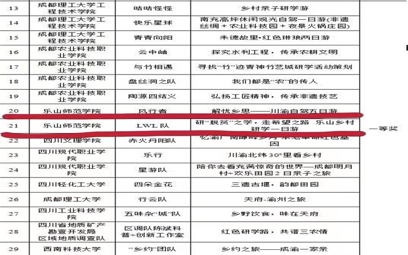 本网讯(文/赵丹萍、左莉 图/赵丹萍)近日,由成渝地区双城经济圈乡村旅游协会校企合作联盟发起,与成渝地区高校共同举办的首届“双城杯”乡村旅游精品线路设计大赛初赛落下帷幕。我校旅游学院组建多支团队参加比赛,共有五支团队获奖,其中特等奖1项,一等奖2项,二等奖2项,继全国大学生红色旅游创意大赛和海南自贸港旅游创新大赛获奖后再次取得新的突破。