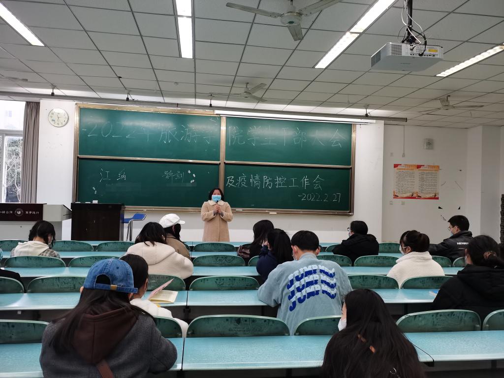本网讯(文/陈涛、图/邹尖)为组织全院学生干部做好新学期各项工作,常态化做好疫情防控,2月27日,旅游学院在行知楼101教室召开了学生干部会议。会议由学院学生管理科科长江纳主持,21级辅导员喻剑以及分团委、学生分会、青年传媒中心全体学生干部参加了会议。