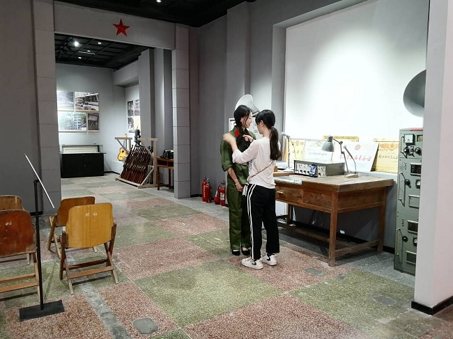 实践团队乘车来到位于遂宁市射洪市的3536三线城旧址基地后,映入队员眼帘的是一块红旗状稻田、一排排军需物资厂房旧址、一栋三线建设博物馆。队员们走进博物馆,一件件实物藏品向大家展示了三线建设时期生产军装被褥等军需物资的历史景象,以及在三线建设过程中展现出的逢山开路遇水架桥的艰苦奋斗精神、争分夺秒不分昼夜的科研精神等。在实地调研的过程中,团队成员欧念、王兰等同学以讲解+录制视频的形式记录了调研过程。