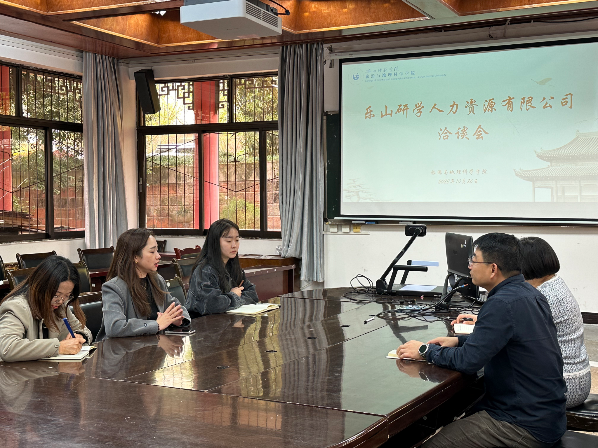 本网讯(图/文 侯怡旭)近日,旅游与地理科学院邀请四川省乐山市研学人力资源有限公司到学院实验楼102教室开展了实习就业洽谈。学院副院长孙永兴、2020级辅导员江纳以及该公司总经理张婉贞等一行四人参加了此次洽谈会。