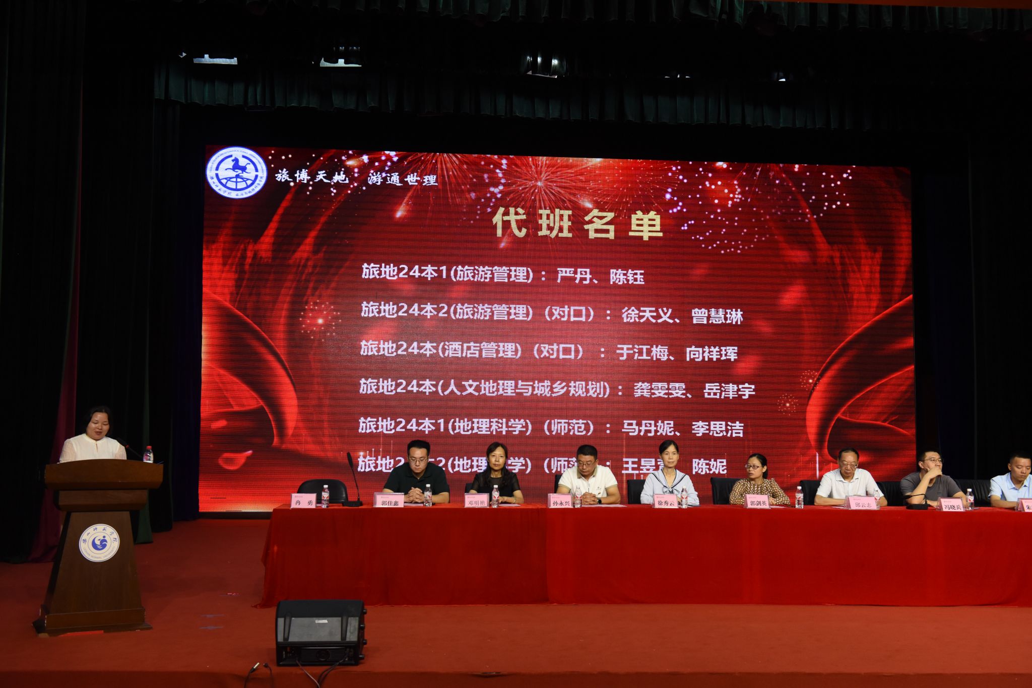 孙永兴宣读了学院2023-2024学年度学生先进个人及团队表彰决定,希望新同学们以优秀的师兄师姐为榜样,争做自强不息的旅地人。
