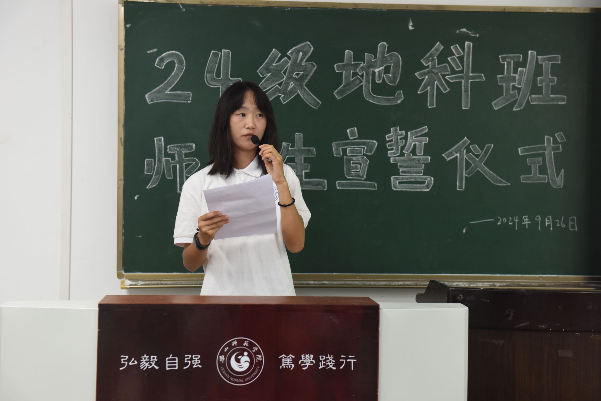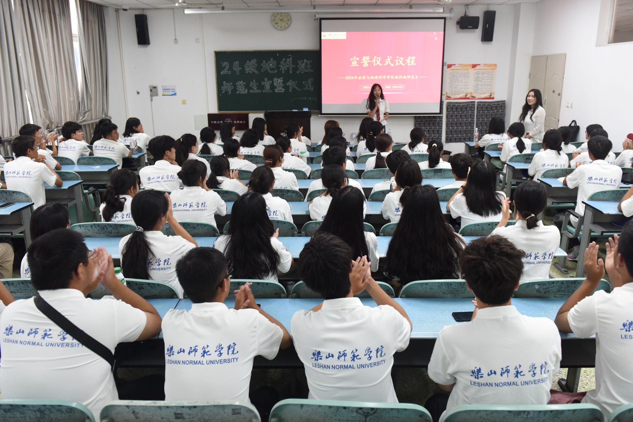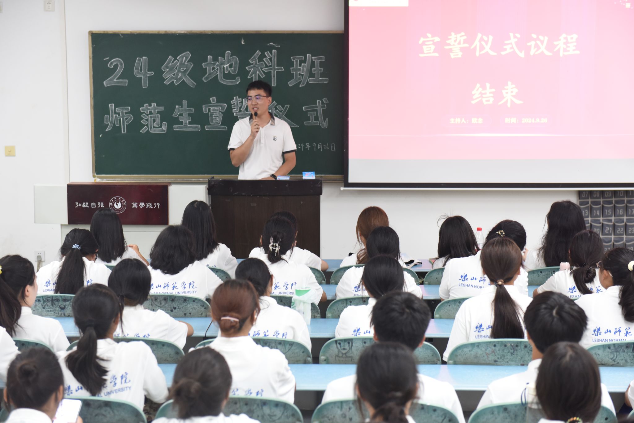 本网讯(文、图/刘涛)9月26日下午,BETWA西汉姆联在行知楼213教室举行“师范生宣誓”活动,24级辅导员王强、班主任向婉丽及24级全体地科班的同学参加了本次活动。