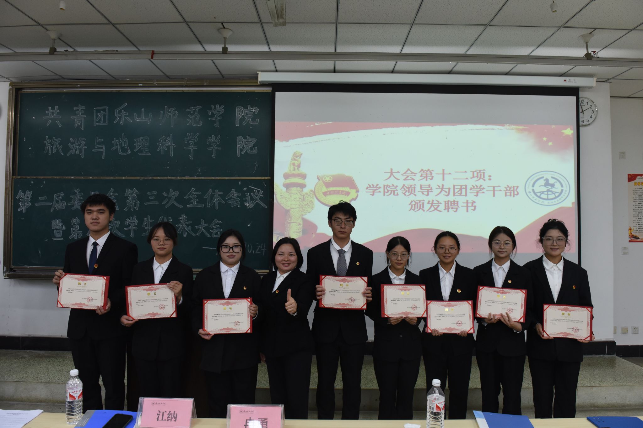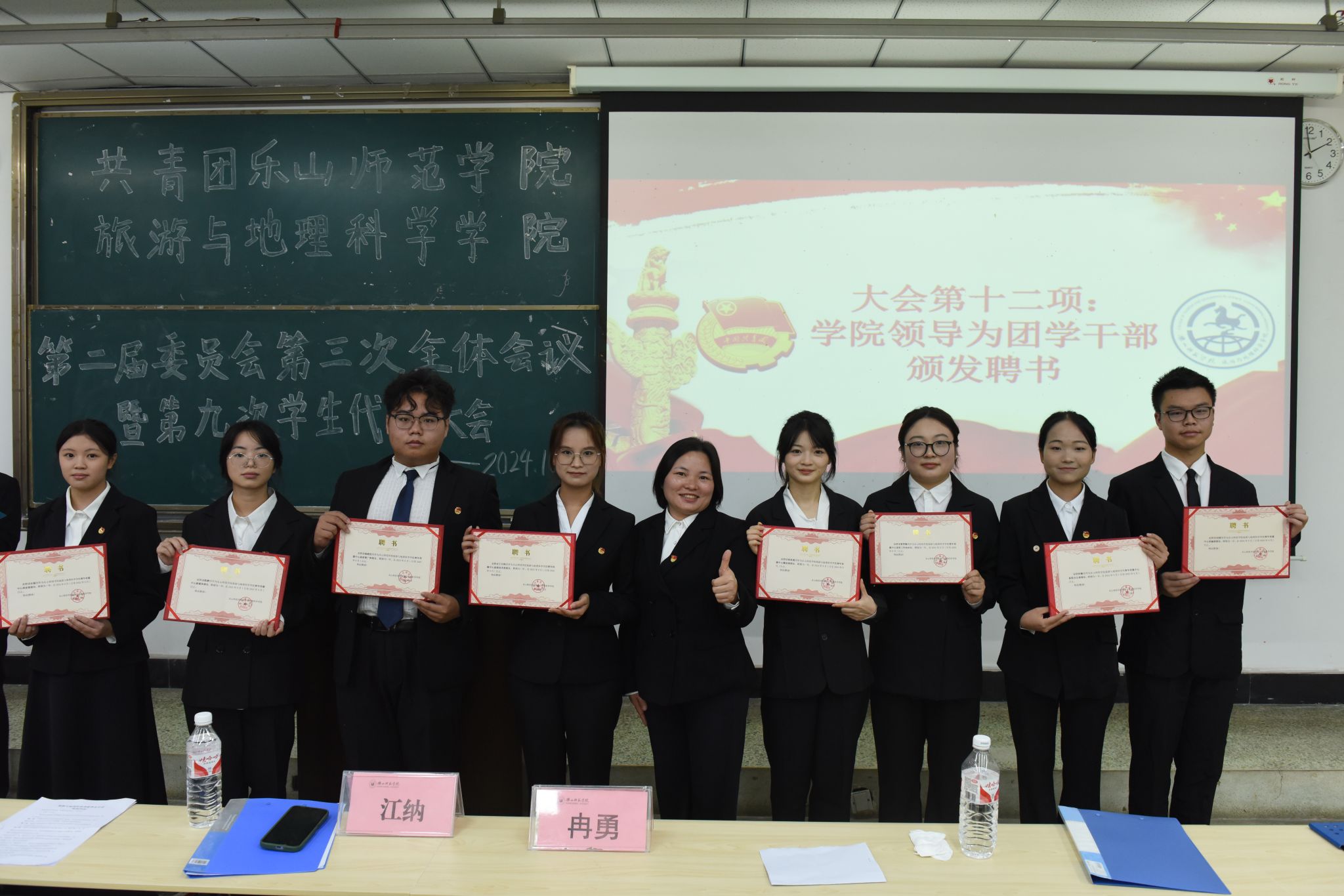 会议在庄严的《国歌》声中拉开帷幕。徐秀云在会议开幕式上致辞,对过去一年学生干部的工作给予了充分肯定,并对学生干部们提出了新的期望,鼓励同学们积极参与学院建设,展示青春风采。学院三大组织做了本年度的工作报告并宣读组织办法。随后,冉勇和江纳为团学干部颁发聘书,并对大家给予鼓励。最后,冉勇为本次会议致闭幕辞,对本次大会圆满成功表示热烈祝贺,对所有参与和支持学生工作的师生表示诚挚感谢。最后,全体参会人员合影留念,会议圆满结束。