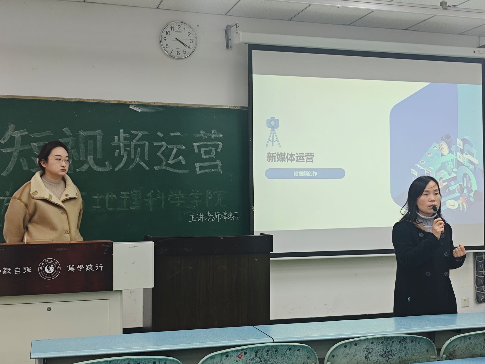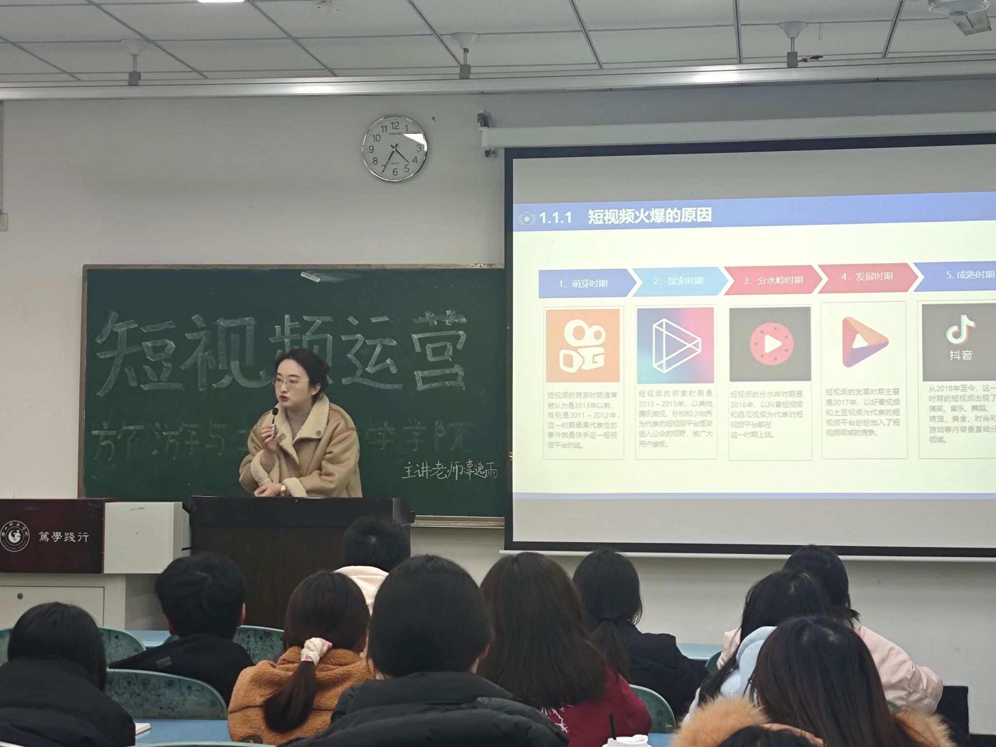 本网讯(文/王小龙、图/杨光)12月5日下午,BETWA西汉姆联于行知楼210教室组织开展了主题为“短视频运营”的培训。学院党委书记徐秀云,学生工作办公室主任、分团委书记江纳莅临培训现场。美术与设计学院教师辜逸雨为学院实践特色班和青年传媒中心的同学们做了专题讲座。