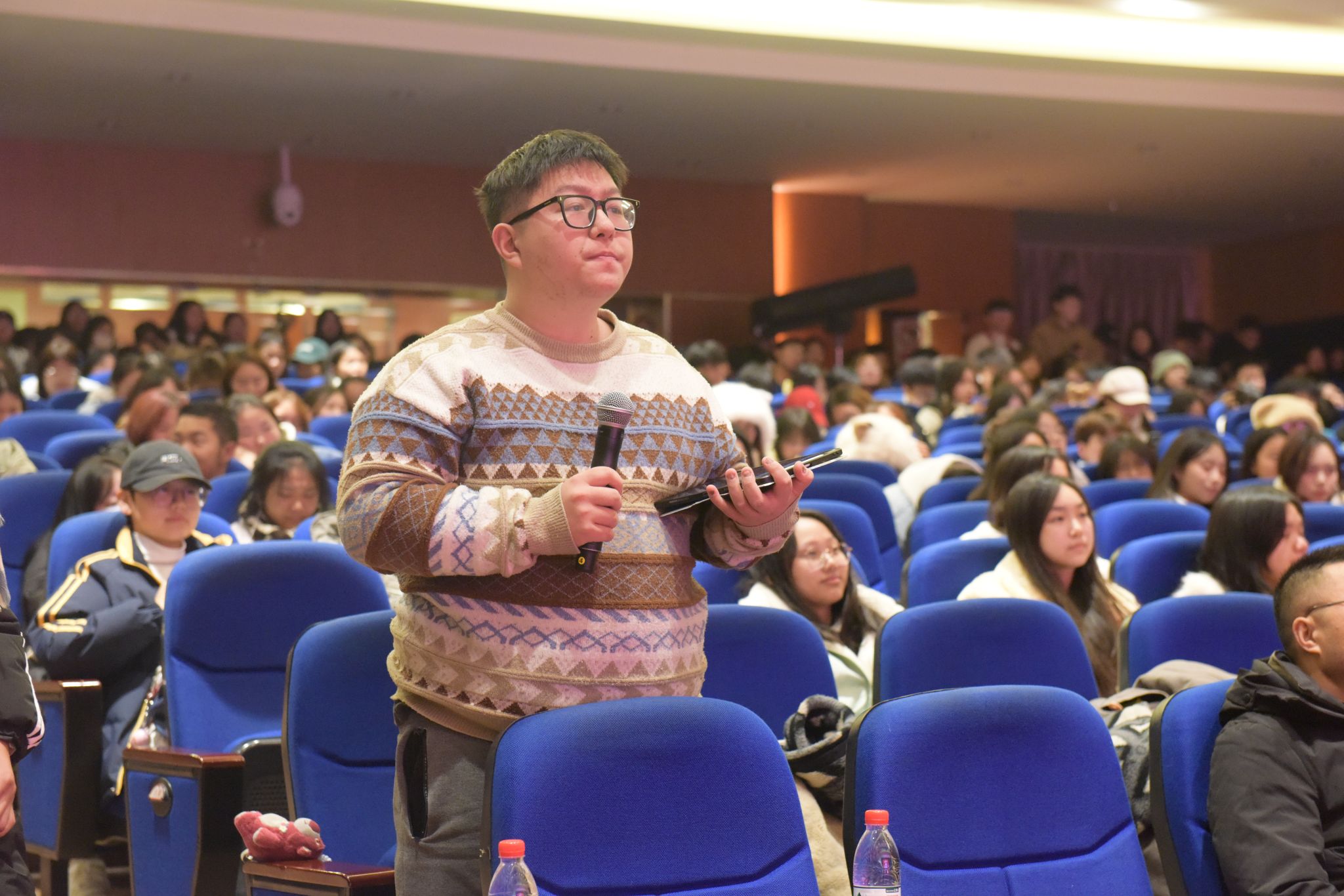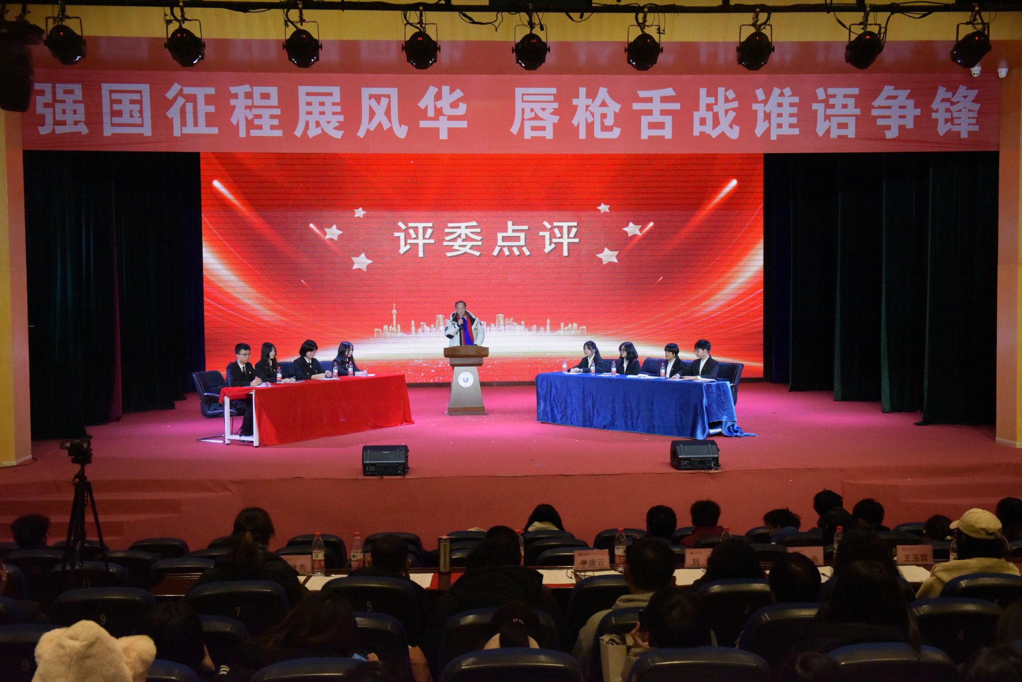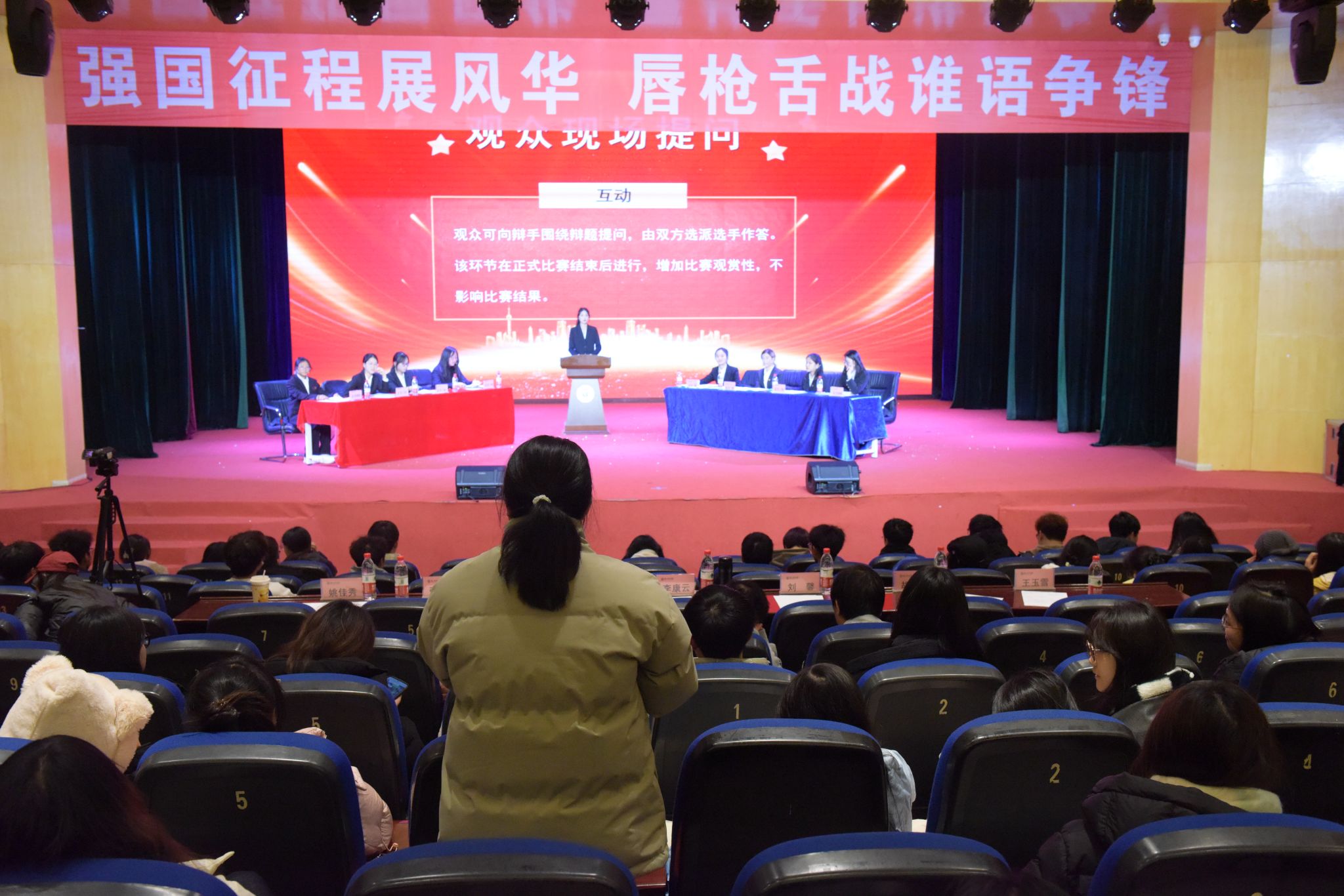 在主持人介绍比赛规则及流程后,决赛正式开始。“网红靠脸/才吃饭更靠得住”“时代青年奔赴民族复兴新征程,奉献精神/脚踏实地更重要”,决赛辩题结合当下热门话题,辩手们围绕各自观点展开激烈交锋。辩手们引用具体数据,言辞犀利。立论目标明确,质询见缝插针,特别是在自由辩论环节,双方辩手你来我往中攻防兼备,激烈的辩论氛围感染了现场观众,大家不时发出阵阵掌声。在观众提问环节,许多同学结合自己的观点和辩手们进行交流讨论。