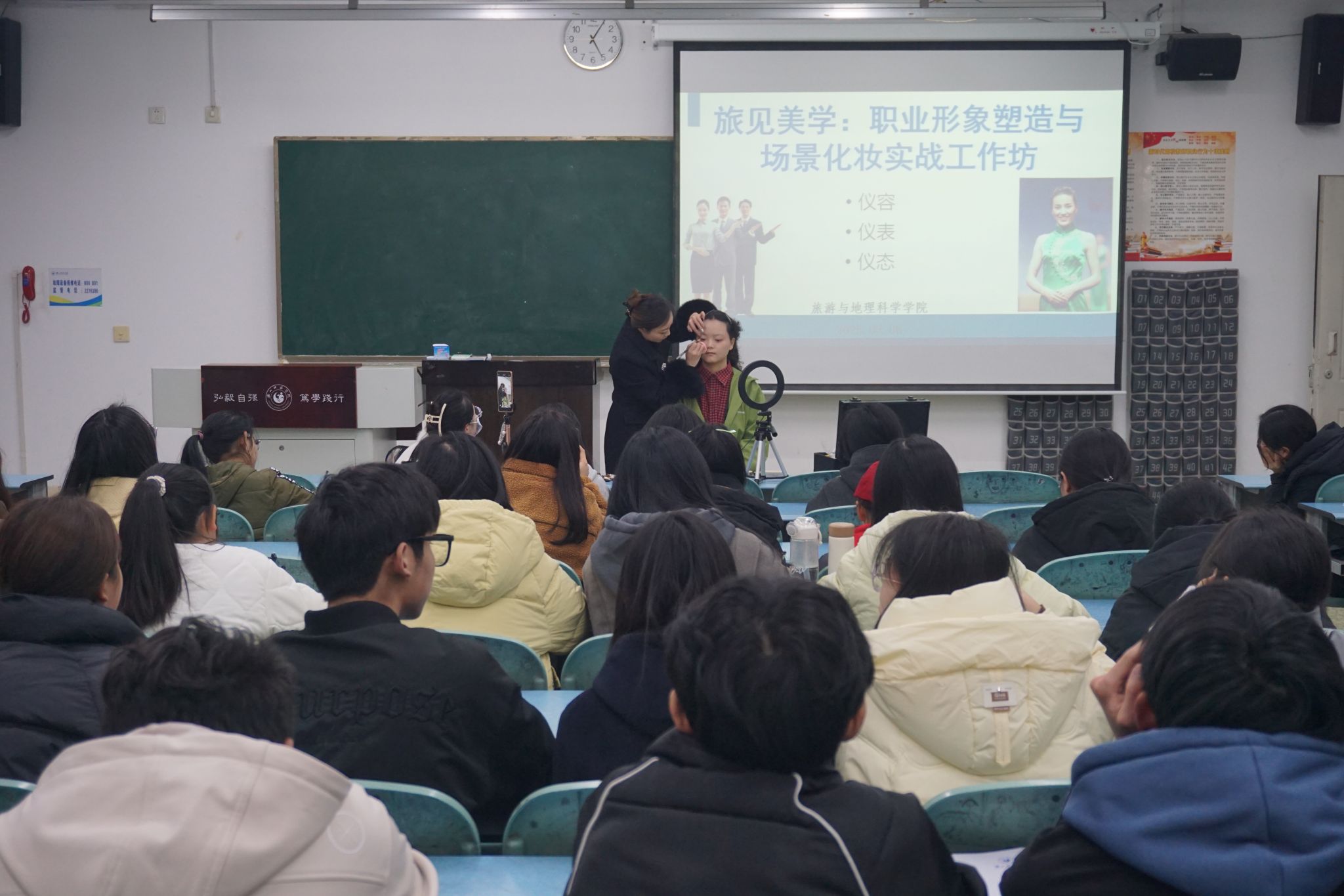 本网讯(文/王小龙、图/李鑫)3月6日下午,BETWA西汉姆联在行知楼208教室举办了“旅见美学:职业形象塑造与场景化妆实战工作坊”。学院党委书记徐秀云、学生工作办公室主任江纳到场指导,特邀天文老师主讲,为学生带来了一堂别开生面的美育实践课。