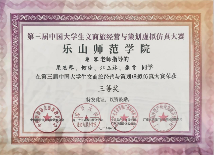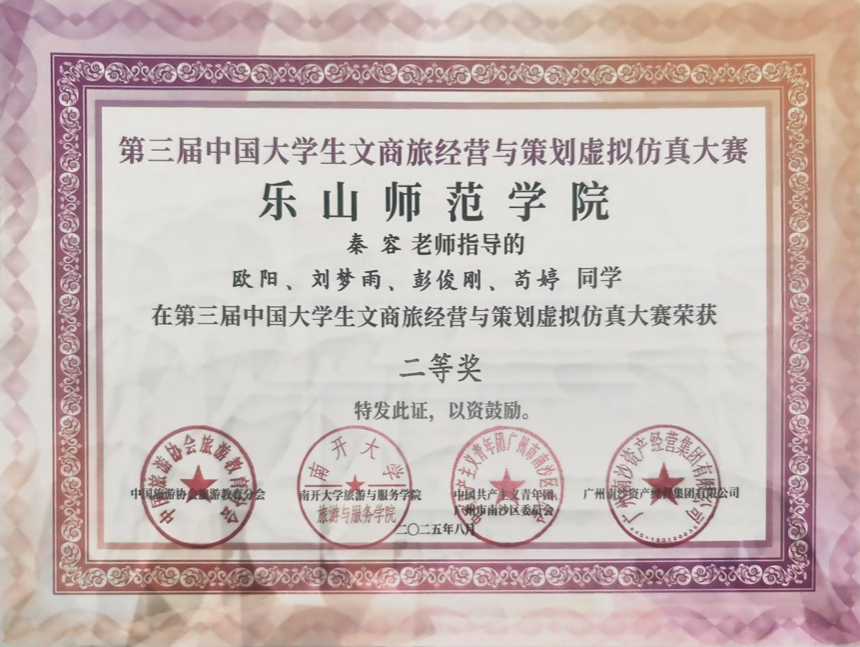 本网讯(文、图/秦容)8月19日至24日,由中国旅游协会旅游教育分会、南开大学旅游与服务学院、中国共产主义青年团广州市南沙区委员会、广州南沙旅游发展有限公司联合主办的第三届中国大学生文商旅经营与策划虚拟仿真大赛决赛在广州市南沙区圆满落幕。我院酒店管理专业的欧阳、旅游管理专业的苟婷、刘梦雨、彭俊刚同学组成的“先锋少年队”荣获二等奖;酒店管理专业的梁思琴、何隆、江玉林、张雪同学获得三等奖。