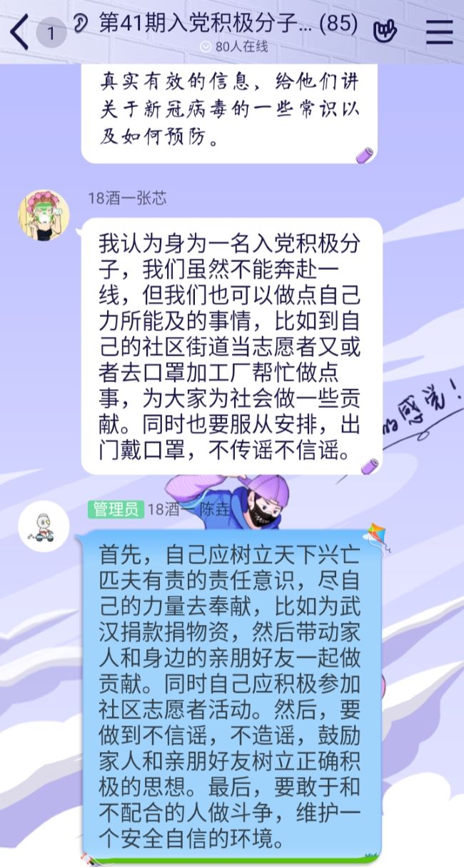 此前,旅游学院分党校已经举办了第四十一期入党积极分子培训开班典礼和第一次理论课学习。本次线上讨论以小组为单位,组织学员在群里发表自己的感悟。学员们踊跃发言,纷纷围绕主题发表自己的看法。大家谈到了要从自身做起,主动响应号召投入疫情防控工作,为疫情防控贡献自己的一份力量。大家将我们国家应对疫情的措施与其他国家进行了对比后,充分体会到了我们国家制度的优越性,更加坚定了加入中国共产党的决心。