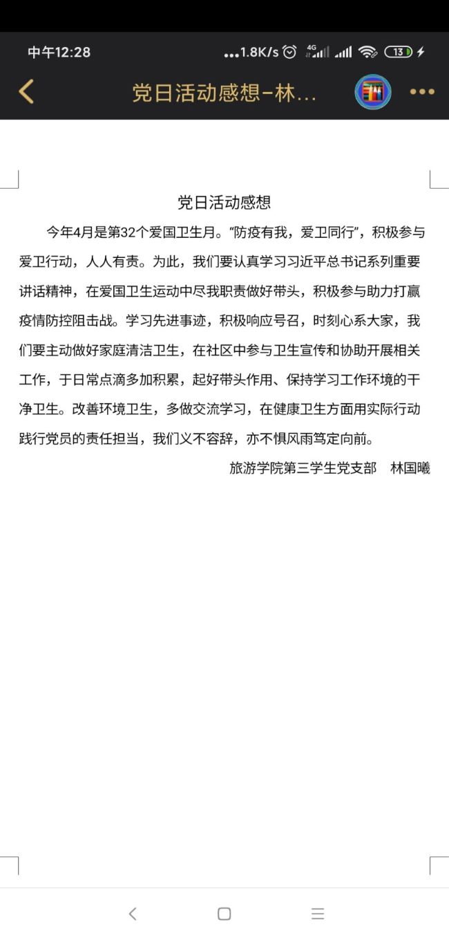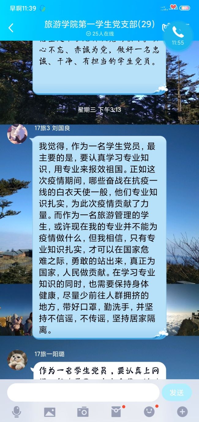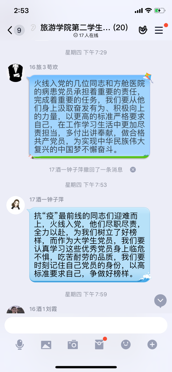 本网讯(文/李朴 图/李小钰)疫情防控期间,为保证学生党员学习不间断不放松,发挥好党支部学习、宣传主阵地的作用,旅游学院三个学生党支部分别在4月中旬运用线上平台开展了“亮身份、亮职责、亮承诺”主题党日活动,学生党支部全体党员参加。
