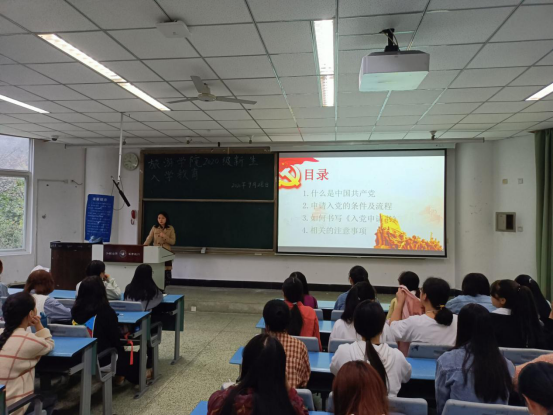 本网讯(图/陈垚 文/陈垚),2020年9月28日,旅游学院学生党建中心在行知楼113、114教室为20级新生开展入党知识教育,17级辅导员谭妙老师为新生们进行讲解。
