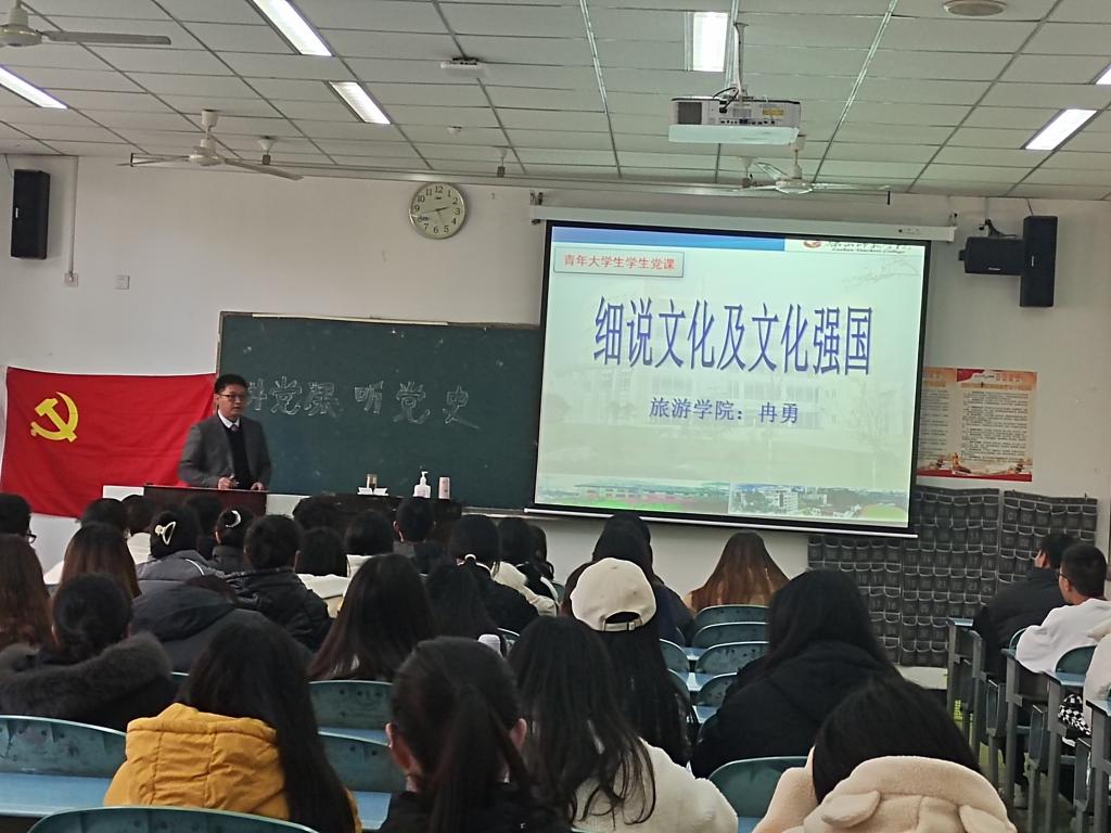 本网讯(文、图/李森)为进一步加强同学们对“文化强国”的认识,12月7日,旅游学院党建中心在行知楼110教室组织开展了党课学习,本次党课由旅游学院党总支副书记冉勇主讲。旅游学院2021年递交了入党申请书的同学参加了此次党课学习。
