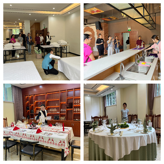 考察首站为学院酒店管理专业实验实训基地。正值学生备战全国旅游院校服务技能(饭店服务)大赛的关键阶段,来访嘉宾现场观摩了中餐摆台、西餐摆台、中式客房铺床、调酒等实训项目。学生以娴熟的技巧和严谨的操作流程,展现了扎实的专业功底——中餐摆台中,餐具定位误差不超过0.5厘米;西餐宴会布置兼顾美学与标准化;调酒表演更是将创意与技艺融合,赢得来访宾客的频频赞许。张林玲表示:“学生操作的规范性和良好的赛场应变能力,充分体现了贵院实践教学体系的高水平设计。”