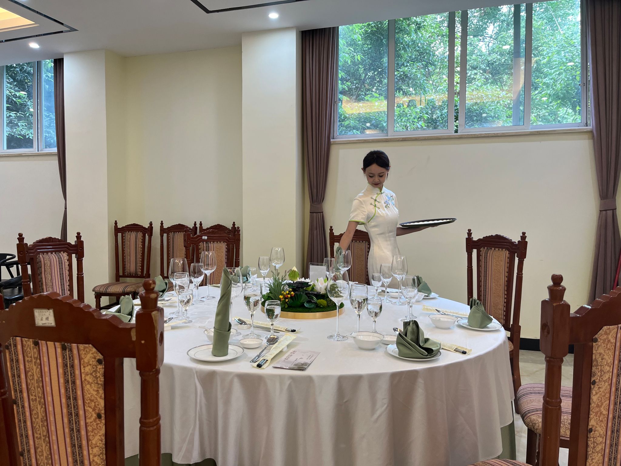 在展示活动正式开始之前,郭剑英强调本次技能展示的核心目标是强化学生的专业技能,提高其实践操作能力。她鼓励同学们在活动中相互学习、共同进步。在鸡尾酒调制环节,荣获第十五届全国旅游院校服务技能(饭店服务)大赛三等奖的李文雅同学现场展示了自创鸡尾酒的调制过程,其动作流畅娴熟,配料比例精确,成功调制出独具特色的创意饮品。获得该赛事二等奖的卢思琦与黄明丽则展示了中西餐摆台技巧,他们操作优雅规范,餐具摆放整齐,餐巾折花精美,充分展现了专业素养。在中式客房铺床展示中,荣获一等奖的林慧同学动作利落、手法娴熟,为学弟学妹们分享了铺床技巧与经验。在虚拟仿真大赛展示环节,欧阳团队与何隆团队带领组员详细介绍了比赛内容与流程,并强调了勤加练习的重要性。秦容、张浩川、王瑛三位老师分别对参与技能展示的同学进行了现场点评,并给予了高度评价。