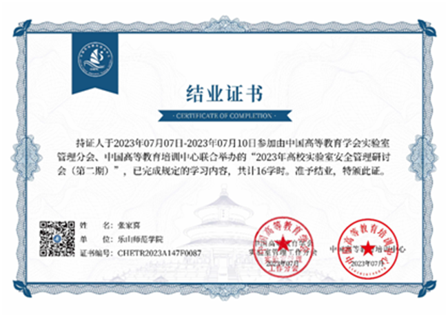 本网讯(图、文/张家喜)2023年7月7日-10日中国高等教育学会实验室管理工作分会联合中国高等教育培训中心在银川举办了2023年高校实验室安全管理研讨会(第二期),本次会议由中国高等教育学会实验室管理工作分会、中国高等培训中心主办,全国各高校实验室安全工作的领导、有关职能部门负责人等千余人出席了该次会议,我院实验室教师张家喜参加了此次会议并取得了相关证书。