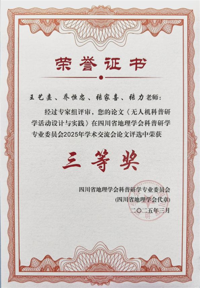 王艺熹的论文《无人机科普研学活动设计与实践》与吴薇的论文《嘉州古城墙研学旅行课程案例分析》荣获大会论文三等奖。两篇论文分别围绕无人机技术在地理科普教育中的创新应用和嘉州古城墙历史文化资源的课程开发实践,展现了旅游与地理科学院在地理科普研学领域的前沿探索和教学创新能力。