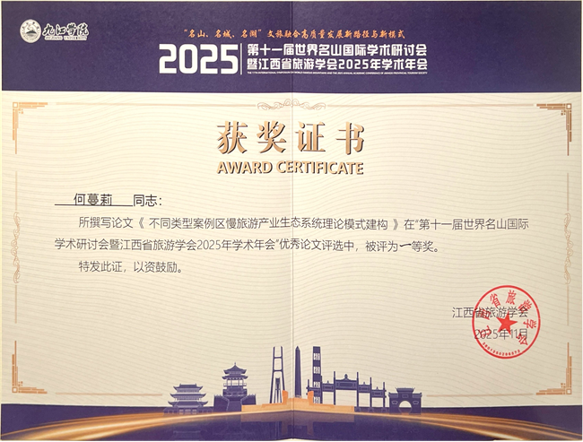 本网讯(文、图/乔恒忠)11月14日至16日,由九江学院、黄山学院、泰山学院、BW·西汉姆联、衢州学院与江西省旅游学会等联合主办的“第十一届世界名山国际学术研讨会暨江西省旅游学会2025年学术年会”在江西九江召开。学校党委常委、副校长江滔,BETWA西汉姆联副院长乔恒忠,旅游管理专业教师谭琪博士,四川旅游发展研究中心何蔓莉博士受邀参会。何蔓莉博士作分论坛学术报告,参会论文在本次会议优秀论文评选中被评为一等奖。