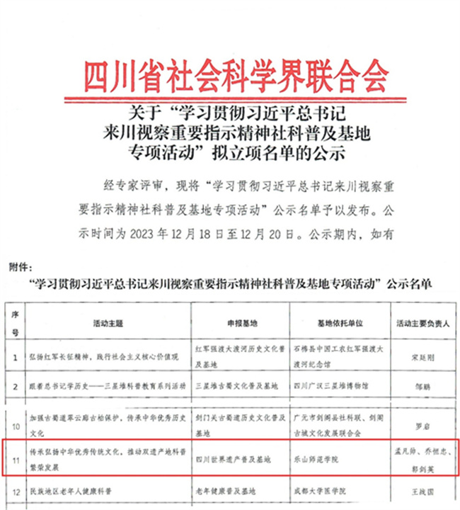 依托我校建设的四川省社会科学普及基地——四川世界遗产普及基地获得立项,项目主要负责人为孟凡帅、乔恒忠、郭剑英,活动项目主题为“传承弘扬中华优秀传统文化,推动双遗产地科普繁荣发展”。本活动项目旨在联系相关哲学社会科学工作者开展系列科普活动,提升群众对乐山市各类文化与自然遗产的了解,为推动巴蜀文化大繁荣、乐山市文旅融合高质量发展做出积极贡献。