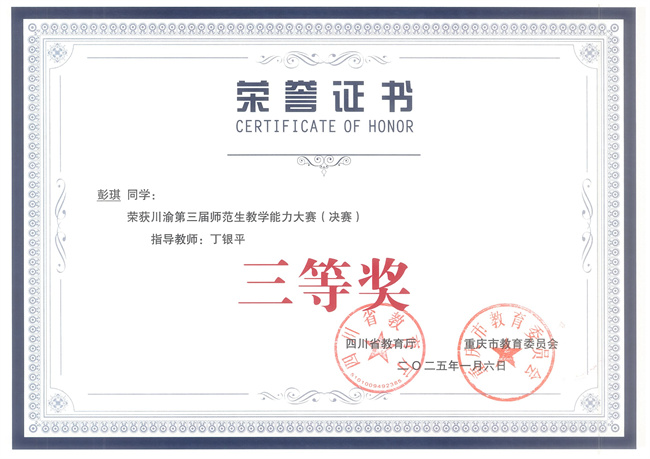 第十届“田家炳杯”全国师范院校师范生教学技能竞赛是面向全国师范院校的高规格比拼。川渝第三届师范生教学能力大赛是聚焦川渝地区师范教育实力的竞技舞台,吸引了越来越多的院校与选手参与,竞争愈发激烈。学院选手凭借深厚的知识根基、刻苦的教学训练和合理的教学设计,一路过关斩将,取得了可喜的成绩。